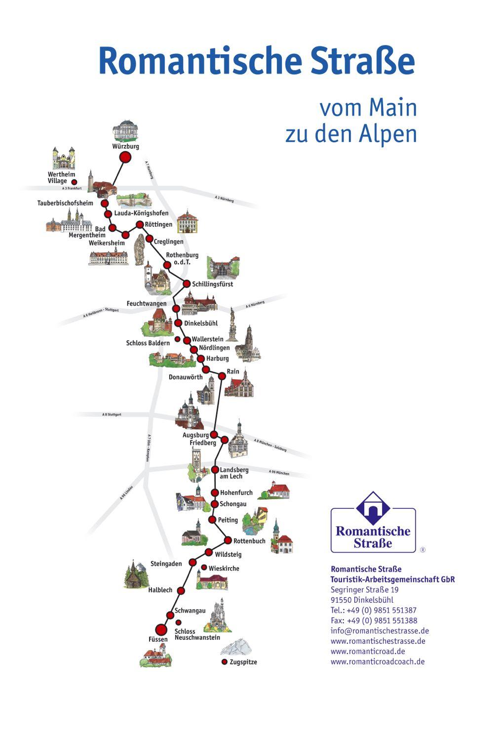 浪漫的公路德国地图。 浪漫的路德国地图(西欧洲-欧洲)进行打印。 浪漫的路德国地图(西欧洲-欧洲)下载。 德国浪漫之路是巴伐利亚州和巴登-符腾堡州南部省份最大的旅游景点之一,如德国浪漫之路地图所示。浪漫之路的概念有点像英国的 "耕夫午餐"--一个看似基于历史和传统的营销理念,但实际上是一个更现代的发明。就 "浪漫之路 "而言,德国在战后急于重建旅游业,正式 "路线 "的概念是在1950年(德意志联邦共和国成立、军管占领结束后不久)提出的。